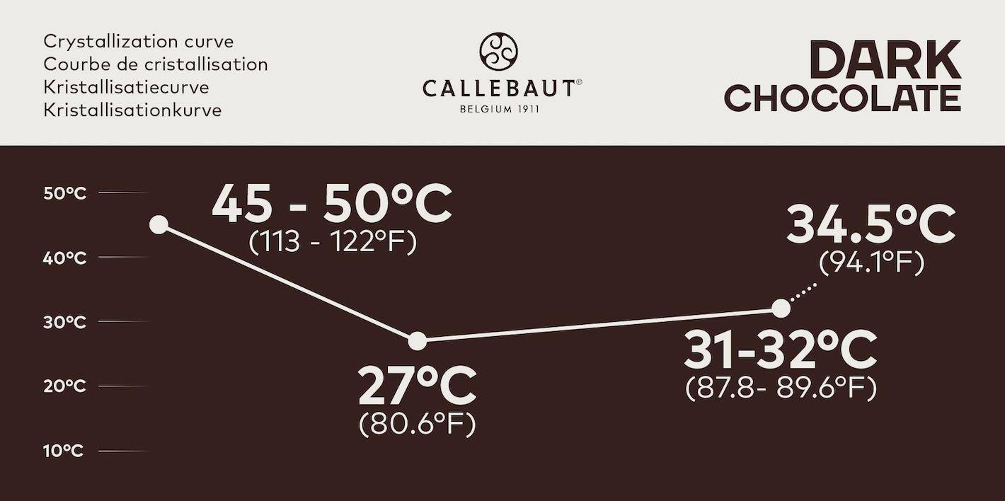 • The third temperature indicates the proper working temperature for the chocolate. You may wish to use a slightly higher or lower temperature depending on your application; this is why a small temperature range is indicated.