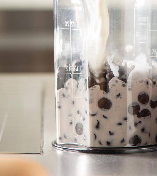 Giet de warme vloeistof over de chocolade en mix met een staafmixer om te emulgeren (hou de kop van de mixer onder het oppervlak om luchtbellen te vermijden).