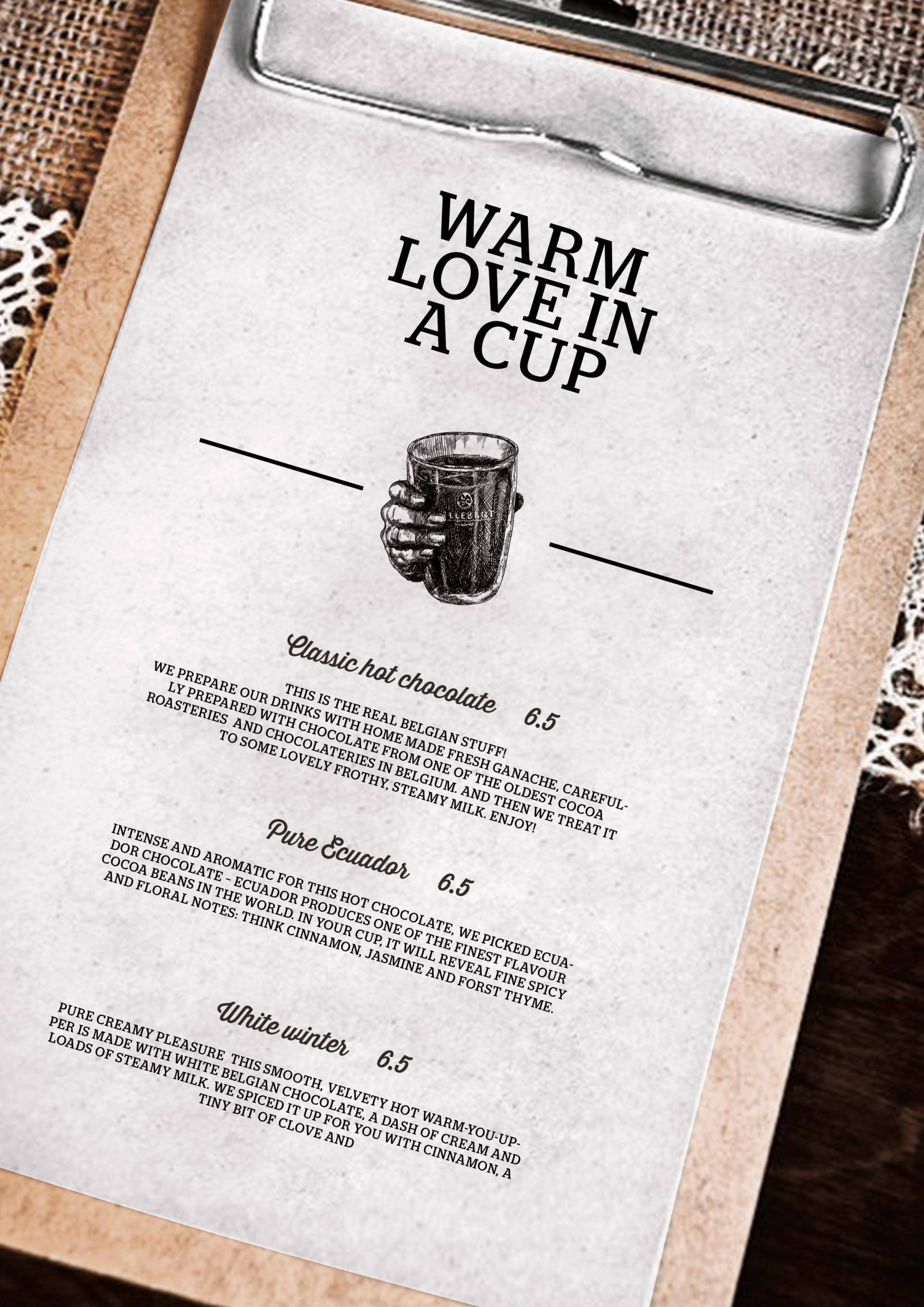 We geloven in een heerlijke chocoladesmaak. Daarom maken wij uw warme chocolademelk met heel veel liefde en uiteraard ook echte chocolade. Geen cacaopoeder - enkel echte, Belgische chocolade. Dat spreekt voor zich!