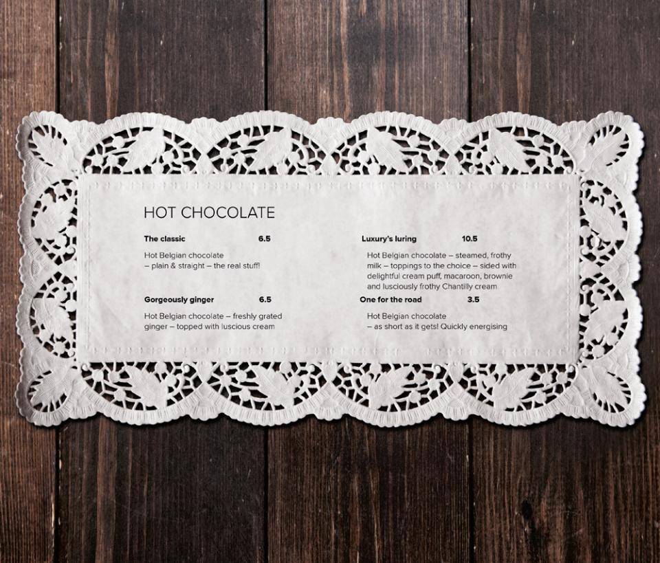 Müşteriler yalnızca muhteşem bir çikolata deneyimi istemez; genellikle içecekleri hakkında daha fazla bilgi edinmek isterler. Kreasyon ve malzemelerin ardında yatan (kısa!) hikaye nedir: çikolatanın tarifi ve orijini, ev yapımı ganaj, süt ürünü veya süt ürünü olmayan süt, kullanılan baharatlar... Bir miktar arka plan bilgisi eklemek, müşterilerinizi denemek için baştan çıkarır.